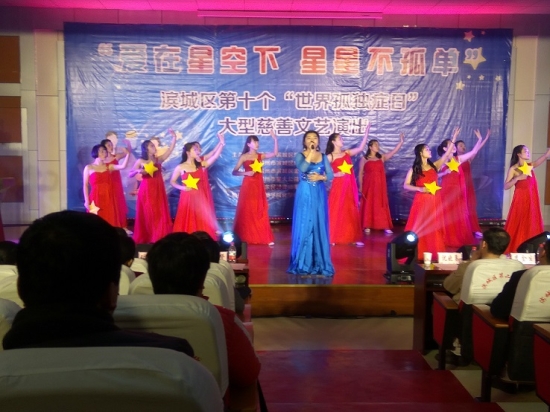 演出伊始,屏幕上播放的短片介绍了自闭症儿童的现状及金钥匙儿童康复中心的概况,使更多的人了解了自闭症儿童与金钥匙儿童康复中心。我院志愿者团队的歌伴舞《星星的孩子》,以优美的旋律,轻柔的舞姿向观众们表达了不歧视、不嘲讽“星星的孩子”的愿望以及对自闭症儿童能够像正常孩子一样生活的美好祝福。