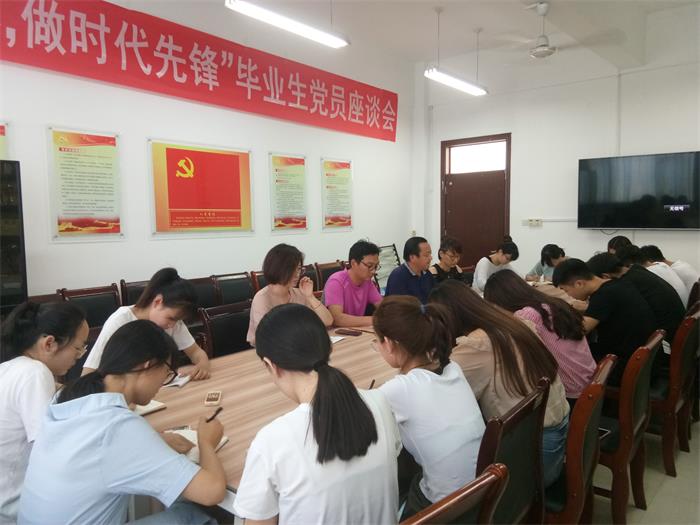 在2019届毕业生即将告别母校之际,为切实加强毕业生党员教育,在今后的工作、学习、生活中继续永葆先进、争做优秀,发挥先锋模范作用,6月4日下午15点,我院在八号教学楼316会议室开展“为党旗添彩,做时代先锋”毕业生党员座谈会。座谈会由学生党支部书记金志杰主持,党总支副书记张健,辅导员马盛楠、张丛丛出席。全体毕业生党员参加。