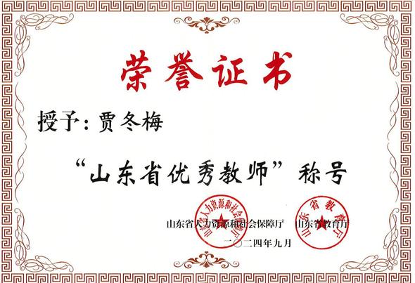 近日,山东省人社厅、山东省教育厅下发关于表彰山东省优秀教师的通报。经各级推荐评审,我院贾冬梅教授获评“山东省优秀教师”荣誉称号。