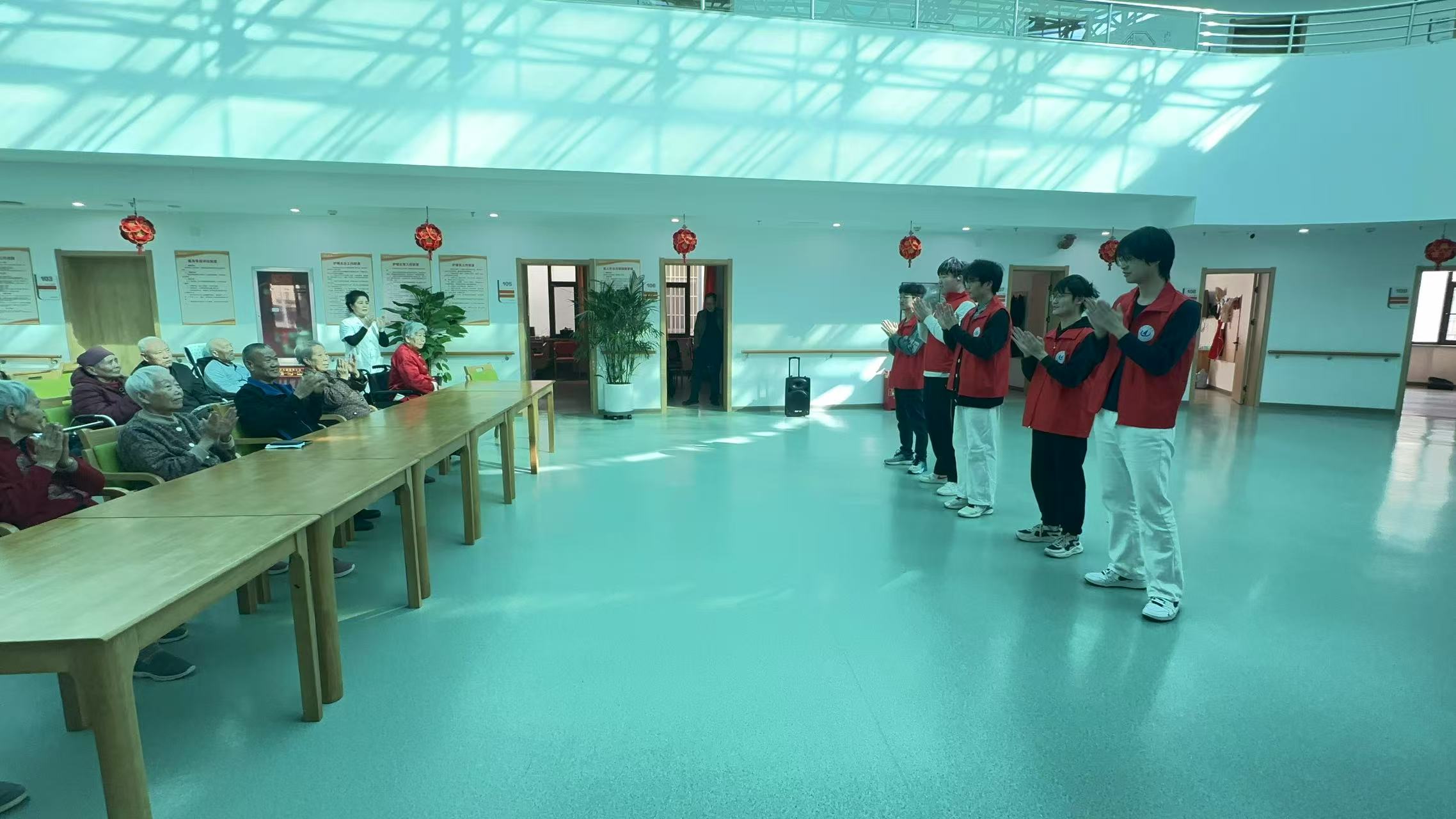 活动伊始,志愿者们以一场精心准备的文艺节目拉开了序幕。歌曲、舞蹈、手势操等丰富多彩的表演形式,为老人们带来了欢声笑语。爷爷奶奶们默契配合,现场气氛热烈温馨,展现了青年学子与老年群体之间的深厚情谊。