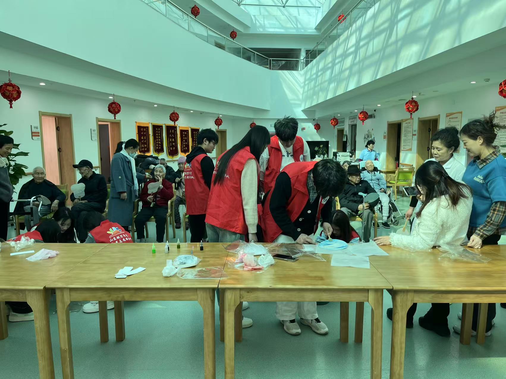 结合专业特色,志愿者们向老人们科普了漆扇的历史文化背景及原材料知识,并带领老人们共同体验非遗漆扇制作。通过调漆、染色、绘制等环节,老人们亲手创作出独具匠心的漆扇作品。在互动中,老人们不仅感受到了传统工艺的魅力,也在欢声笑语中拉近了与志愿者们的距离。